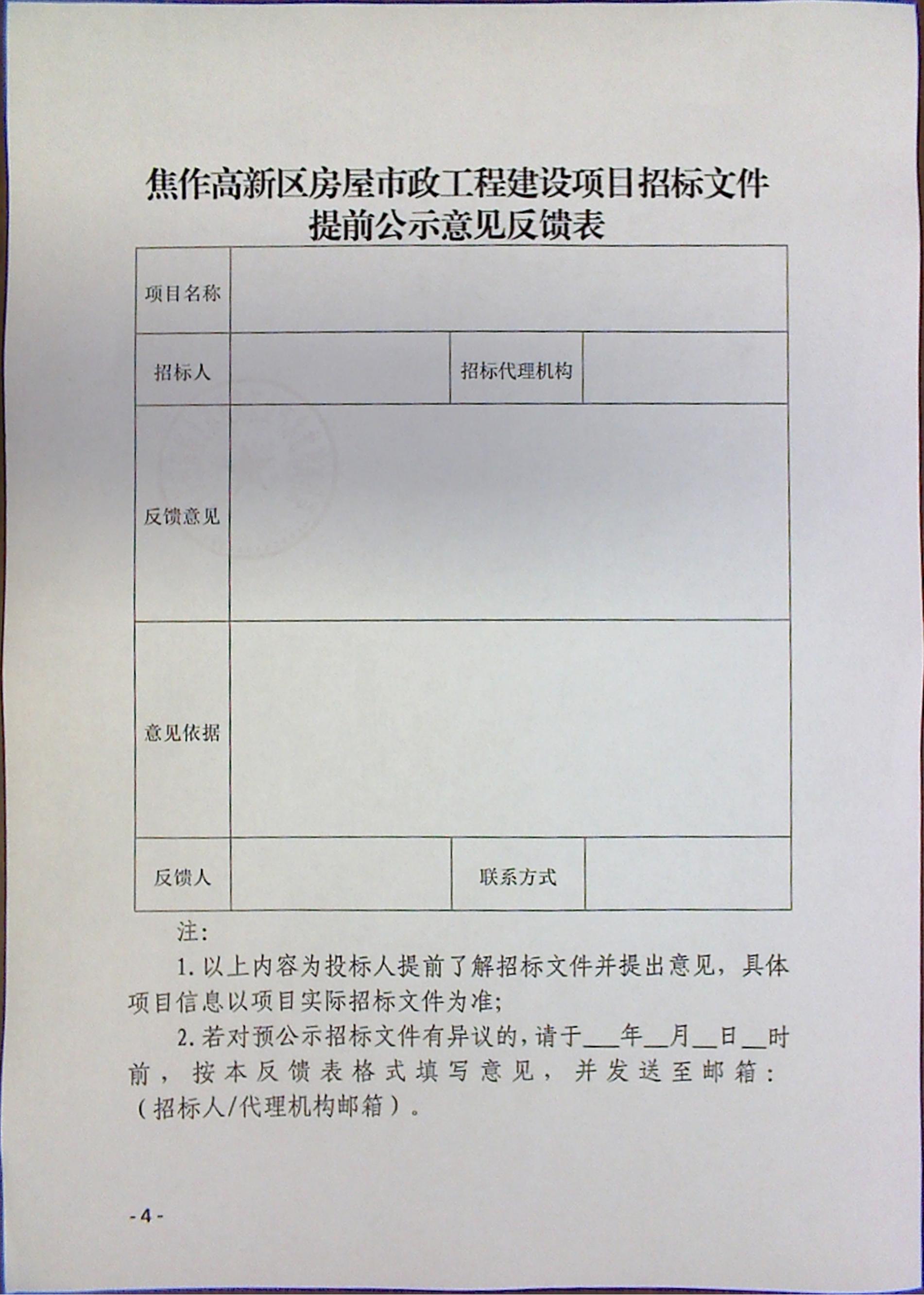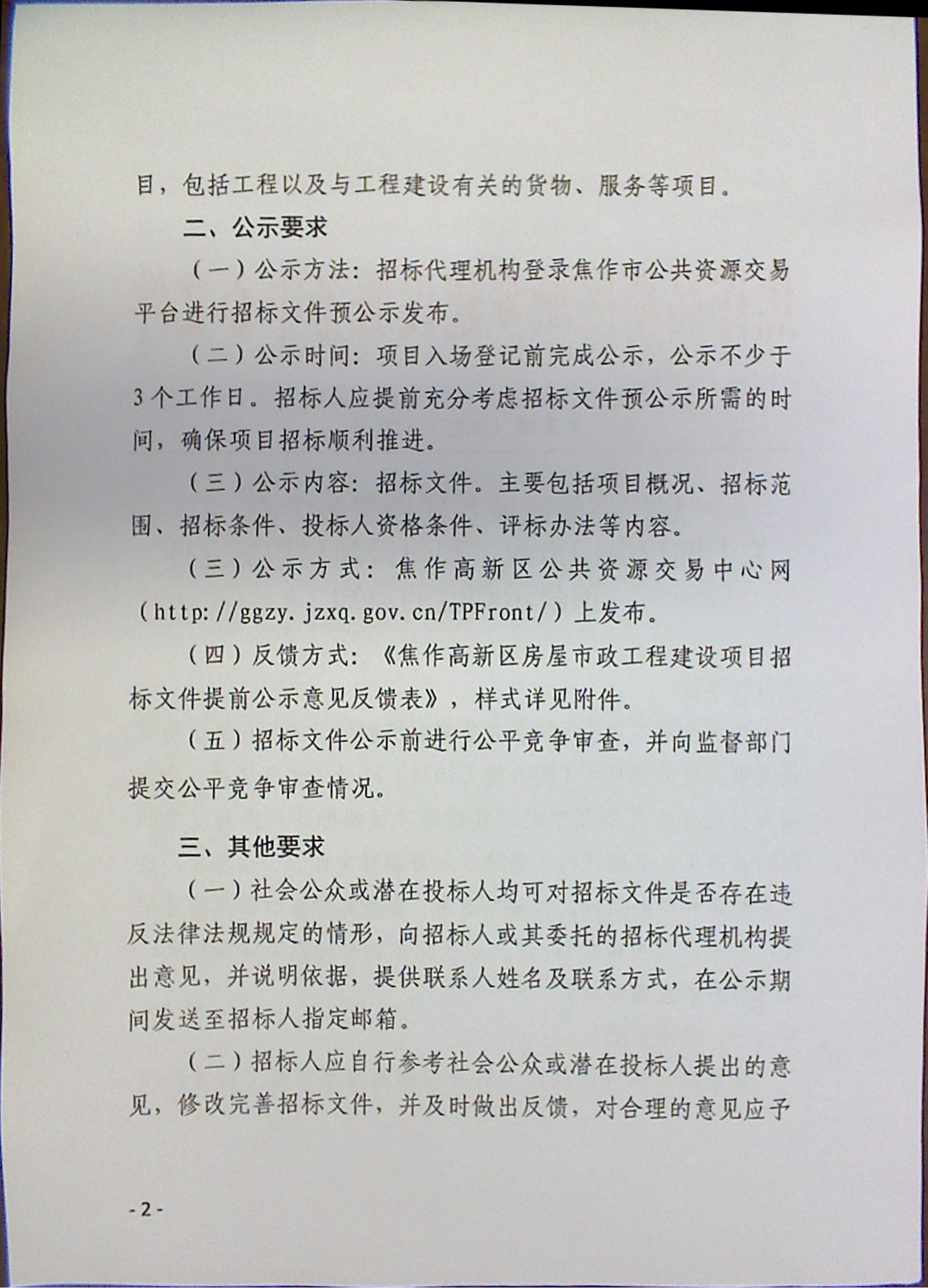 焦作高新区城乡建设服务中心关于推行房屋市政工程建设项目招标文件预公示制度的通知
